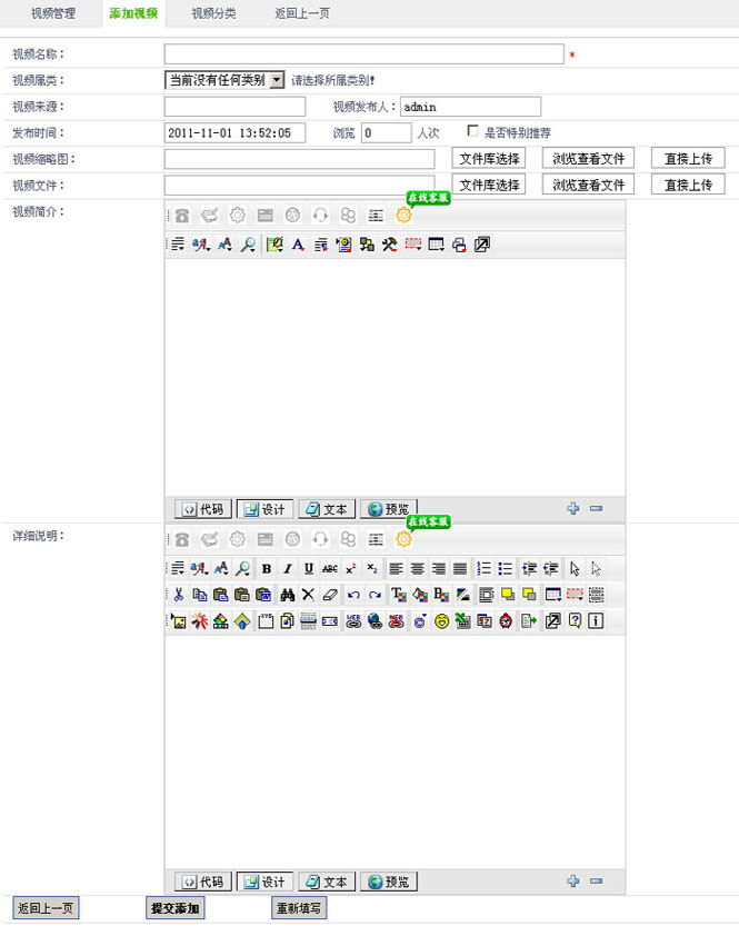 8.在“視頻文件”字段,可以選擇直接上傳和文庫(kù)選擇,添加您視頻文件。