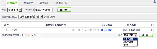 3.在“在招聘列表”,設(shè)置招聘的SEO配置(詳細【3.4.1】章節(jié)進行介紹)、修改、取消招聘,刪除等操作。