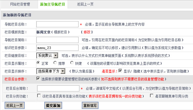 11.在“欄目后臺(tái)參數(shù)”字段,如不選擇則表示不需要欄目的信息管理功能。