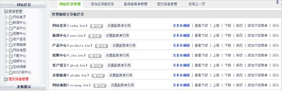 在欄目列表中可以對欄目進(jìn)行(隱藏、設(shè)置幅菜單是否引用、欄目SEO編輯、上下移動、修改、添加下級菜單刪除等操作),(系統(tǒng)默認(rèn)欄目無法刪除,只能移動或是隱藏)。