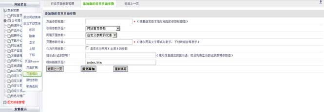 左則菜單管理>鼠標(biāo)右鍵>頁(yè)面模塊>頁(yè)面參數(shù)管理>添加新的頁(yè)面參數(shù),如下圖