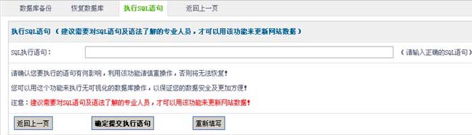 執(zhí)行SQL語句 (建議需要對SQL語句及語法了解的專業(yè)人員,才可以用該功能來更新網(wǎng)站數(shù)據(jù))請確認您要執(zhí)行的語句有何影響,利用該功能請慎重操作,否則將無法恢復(fù)!您可以用這個功能來執(zhí)行無可視化的數(shù)據(jù)庫操作,以保證您的數(shù)據(jù)安全及更加方便!注意:建議需要對SQL語句及語法了解的專業(yè)人員,才可以用該功能來更新網(wǎng)站數(shù)據(jù)!