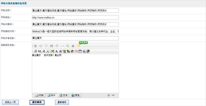 5.在“底部版權(quán)信息”字段,輸入網(wǎng)站的名稱,版權(quán)開(kāi)發(fā)日期等。