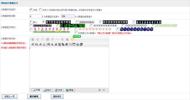啟用網(wǎng)站計數(shù)器功能,可以您查看您網(wǎng)站被人訪問的次數(shù)。目前系統(tǒng)的計數(shù)器,運(yùn)行穩(wěn)定、顯示速度快、12種豐富計數(shù)器圖片樣式提供選擇。翼企魔方提供開放第三方接口,選擇 ,可以在“計數(shù)器引用代碼”字段里添加第三方計數(shù)器。